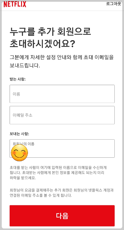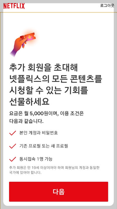 넷플릭스 추가회원 등록에 대해 알아보겠습니다. 이제는 넷플릭스 계정공유가 같은 집에 함께 거주하는 사람에 한해서만 계정공유가 가능해 졌습니다. 멤버십등급 스탠다드 이상은 월5,000원으로 추가회원 자리를 구매하여 공유를 할수 있습니다. 저와 동생이 함께 사용중이었는데 안되더라구요. 모바일어플는 해보려 했는데 알아보니 PC홈페이지로 들어가 추가회원 등록이 가능했습니다.